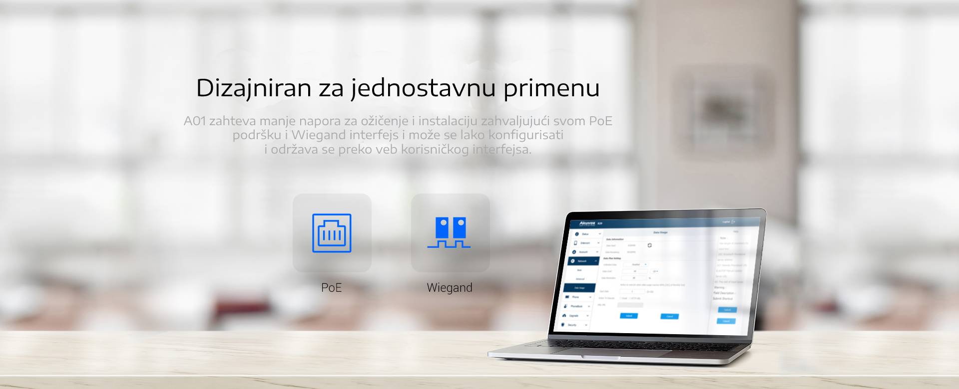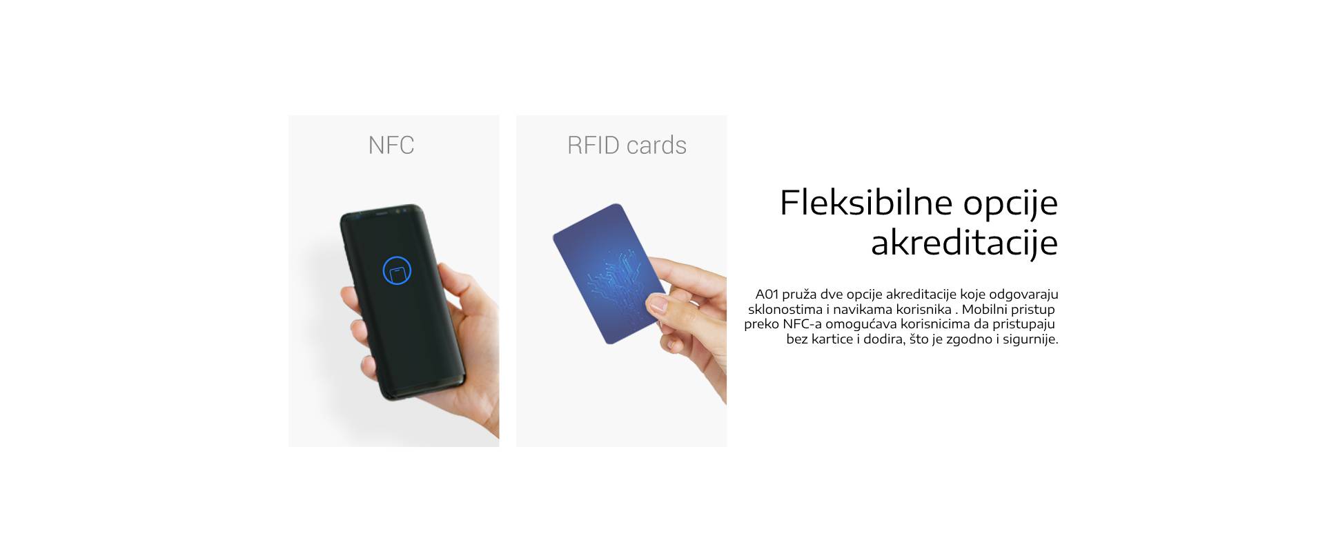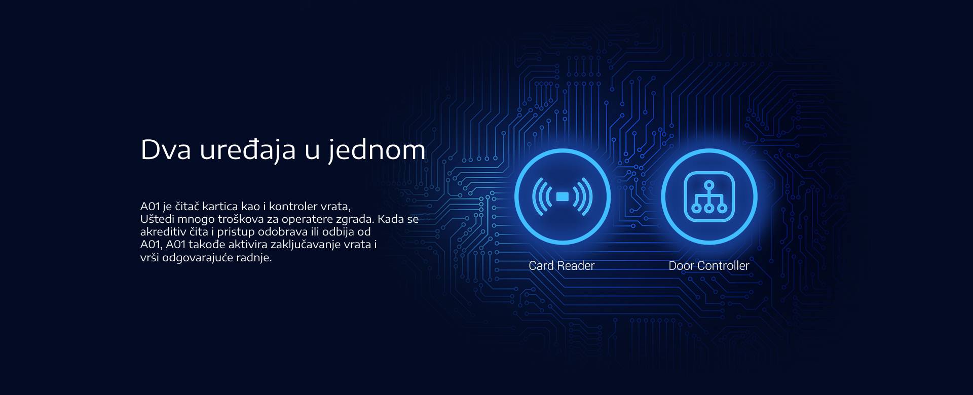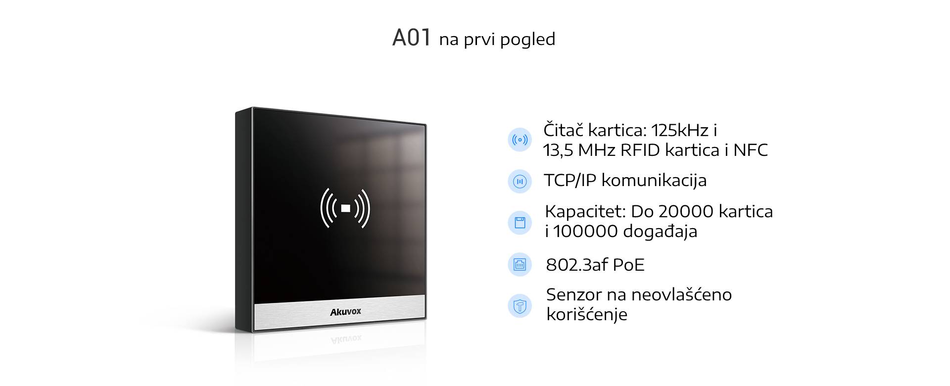 A01 je IP terminal za kontrolu pristupa koji kombinuje kontroler vrata i čitač kartica u jednom uređaju. Podržava RFID kartice i mobilni pristup preko NFC-a, nudeći korisnicima fleksibilnost u opcijama akreditiva.