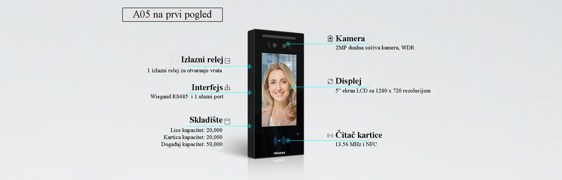 A05 je komercijalni terminal za kontrolu pristupa koji nudi brzu, sigurnu i praktičnu kontrolu pristupa putem prepoznavanja lica uz pomoć AI tehnologije, mobilnih aplikacija, NFC-a ili QR kodova. Tipično se koristi u komercijalnim i stambenim zgradama.