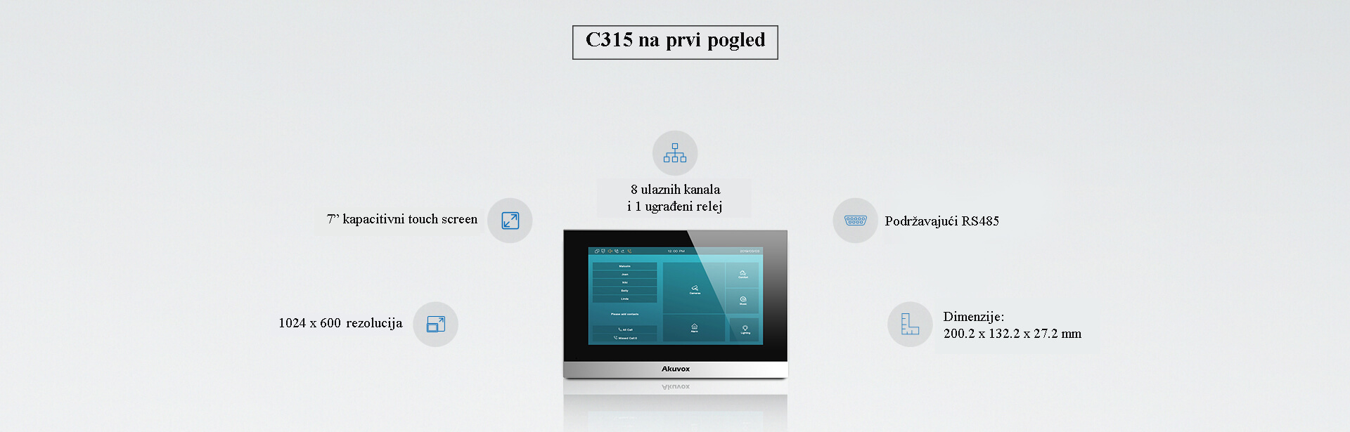 Akuvox C315 je 7-inčni Android monitor. Sa kompaktnim kućištem, uklapa se u ograničeni prostor i nudi veliki broj karakteristika. Tipično se koristi u stanovima.