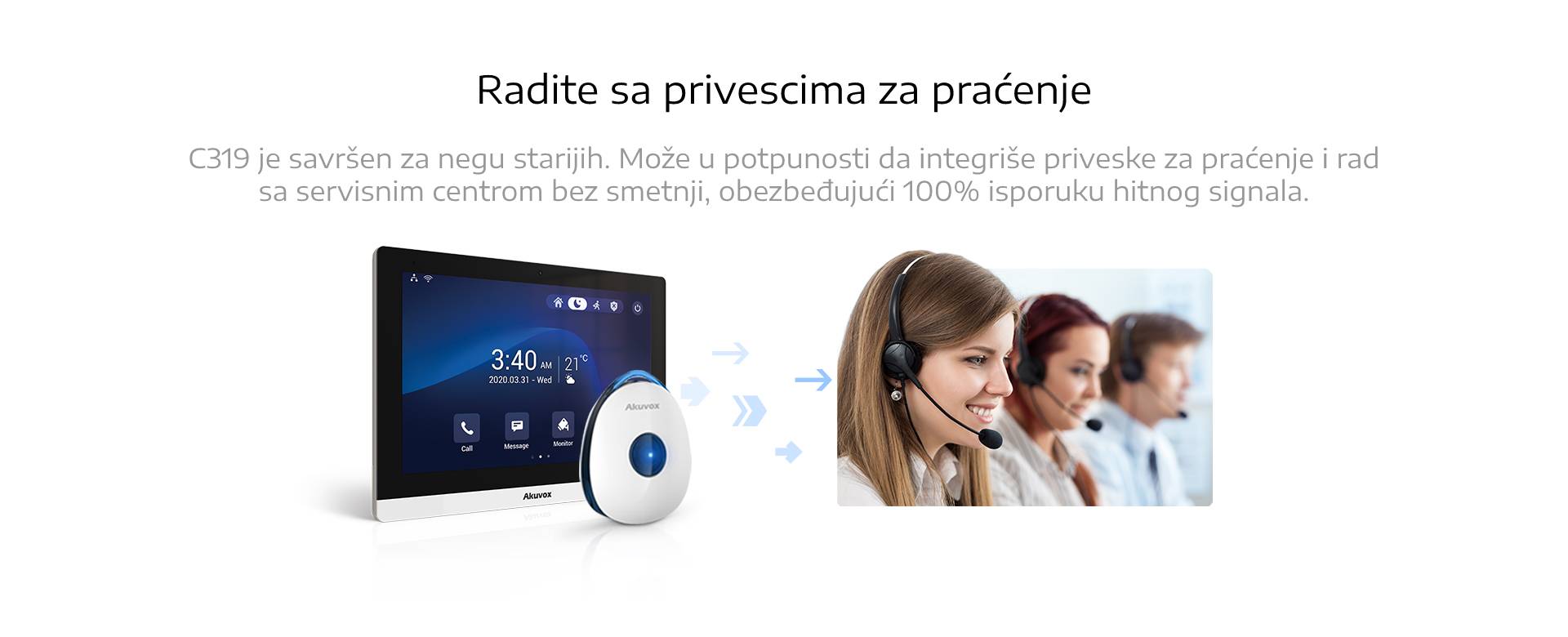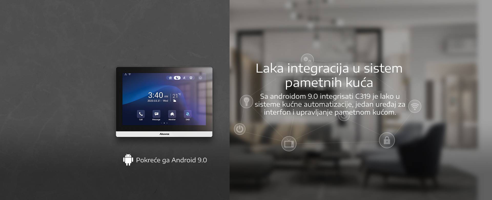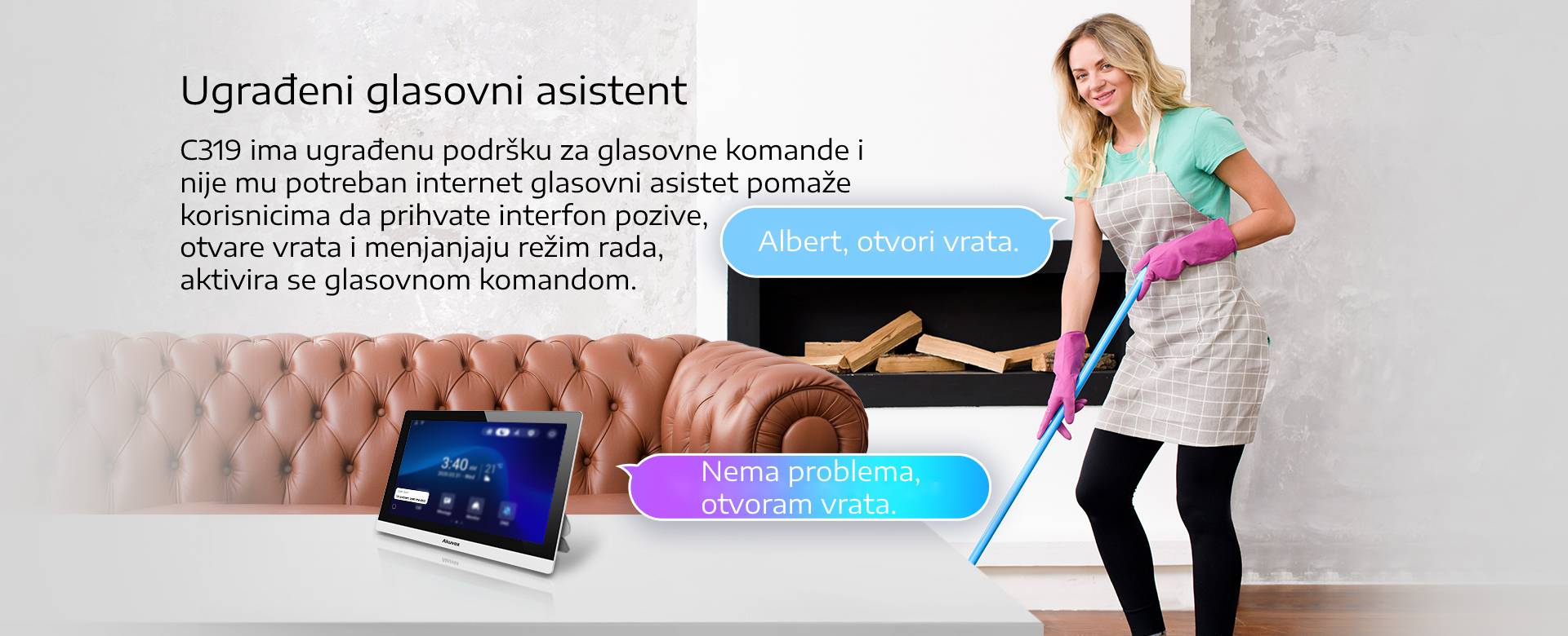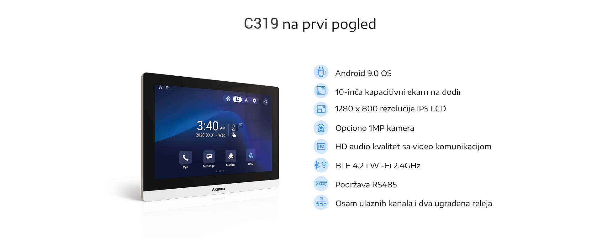 Akuvox C319 je 10-inčni Android monitor za zatvorene prostore sa funkcijama pametnog interfona za ljude svih uzrasta, intuitivnim korisničkim interfejsom koji čak i deca nauče da brzo koriste, mogućnošću integrisanja privezaka za starije osobe i ugrađenim glasovnim asistentom za mlade.