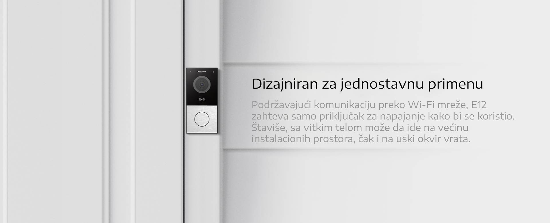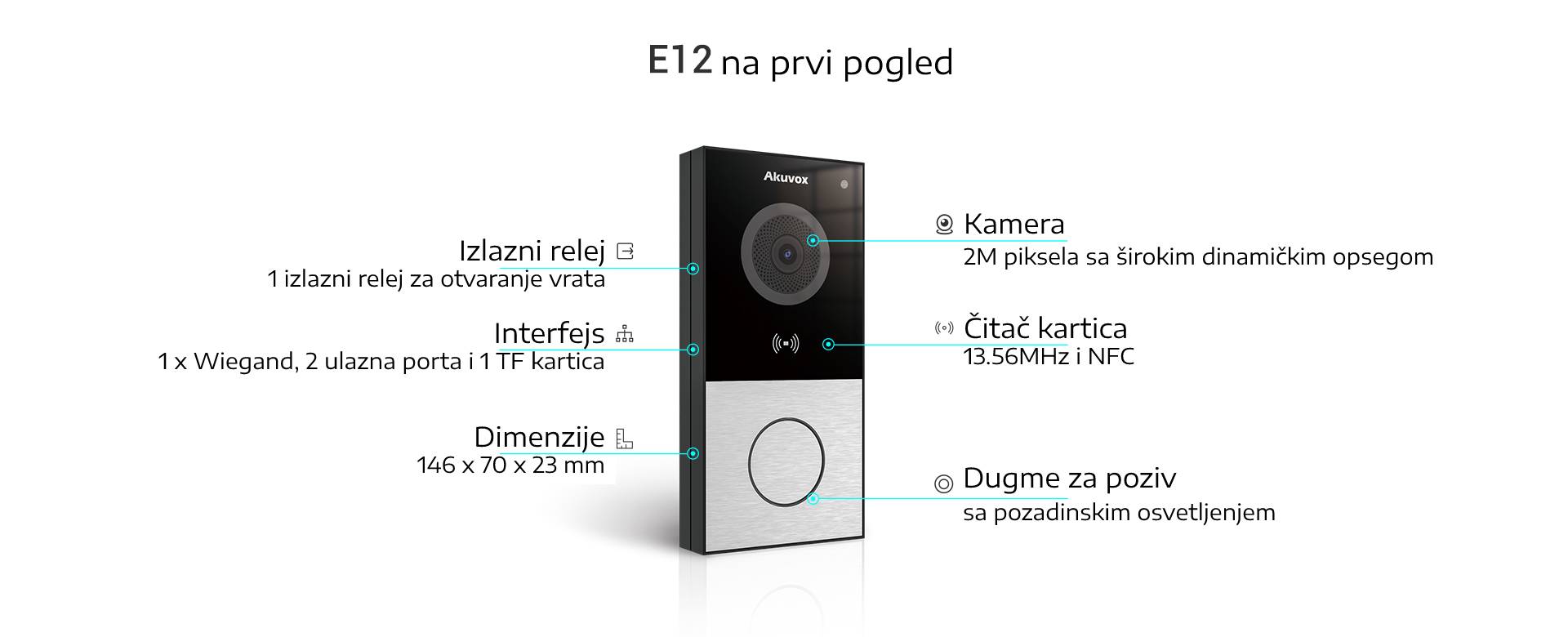E12 je SIP video interfon sa jednim dugmetom za sve tipove ulaznih vrata, bilo da se radi o kućama, stanovima ili kancelarijama. Uprkos tankom kućištu, može se pohvaliti mnogim najsavremenijim funkcijama, kao što su mobilni pristup i bežična komunikacija.