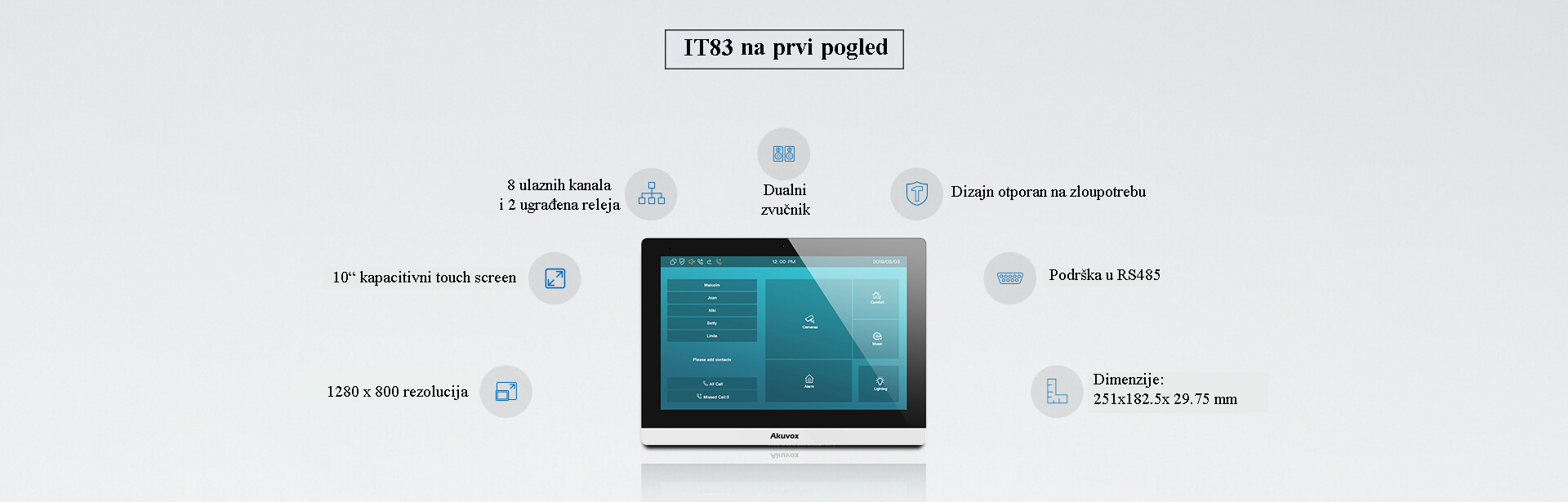 Akuvox IT83 je 10-inčni Android monitor koji pruža sjajan vizuelni prikaz i doživljaj ekrana osetljivog na dodir. Tipično se koristi u vrhunskim rezidencijama.